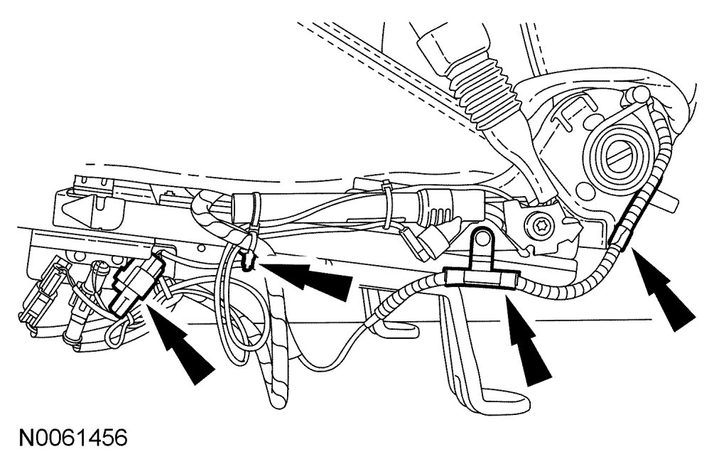 CAUTION:Note the position of the wiring harness, to aid installation. An incorrectly routed wiring harness could become damaged when the seat is moved.