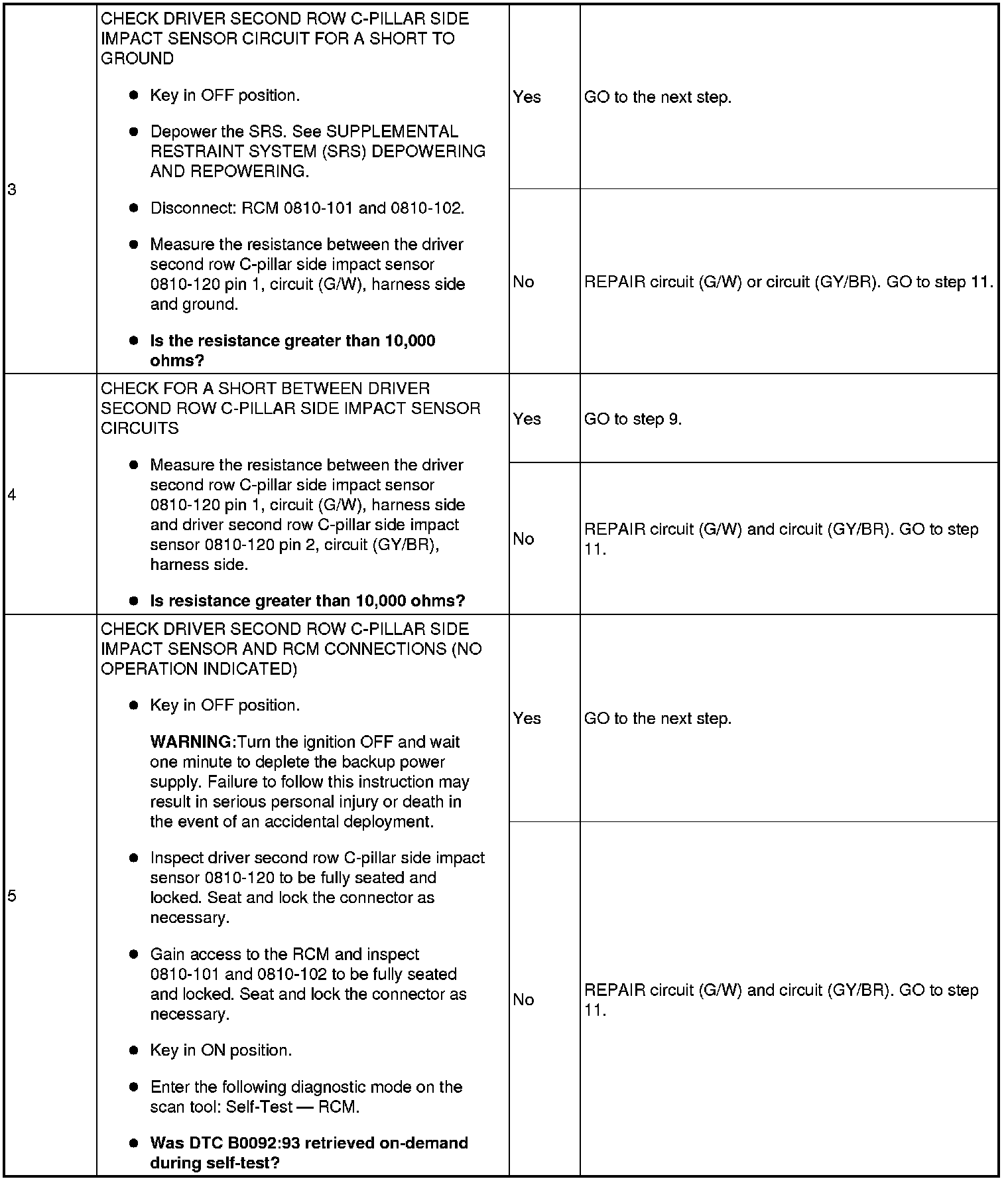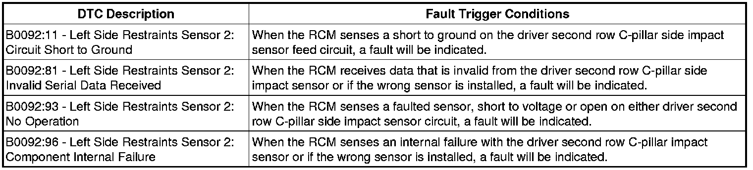 The Restraints Control Module (RCM) checks the driver second row C-pillar impact sensor (left side restraints sensor 2) and circuits for faults. If a fault is detected, the RCM will store DTC B0092:11, 81, 93 or 96 in memory and send a message to the Instrument Cluster (IC) to illuminate the air bag warning indicator.