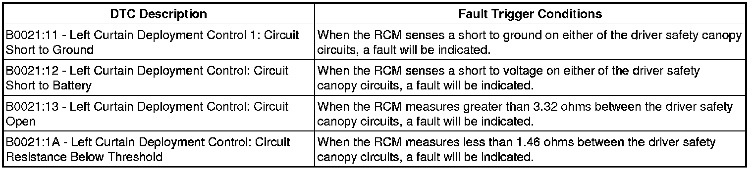 The Restraints Control Module (RCM) continuously monitors the driver safety canopy (left curtain deployment control 1) circuits for the following faults: