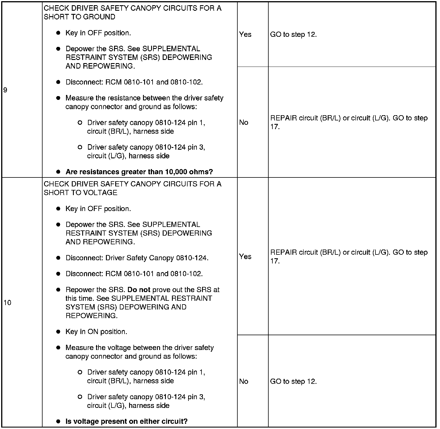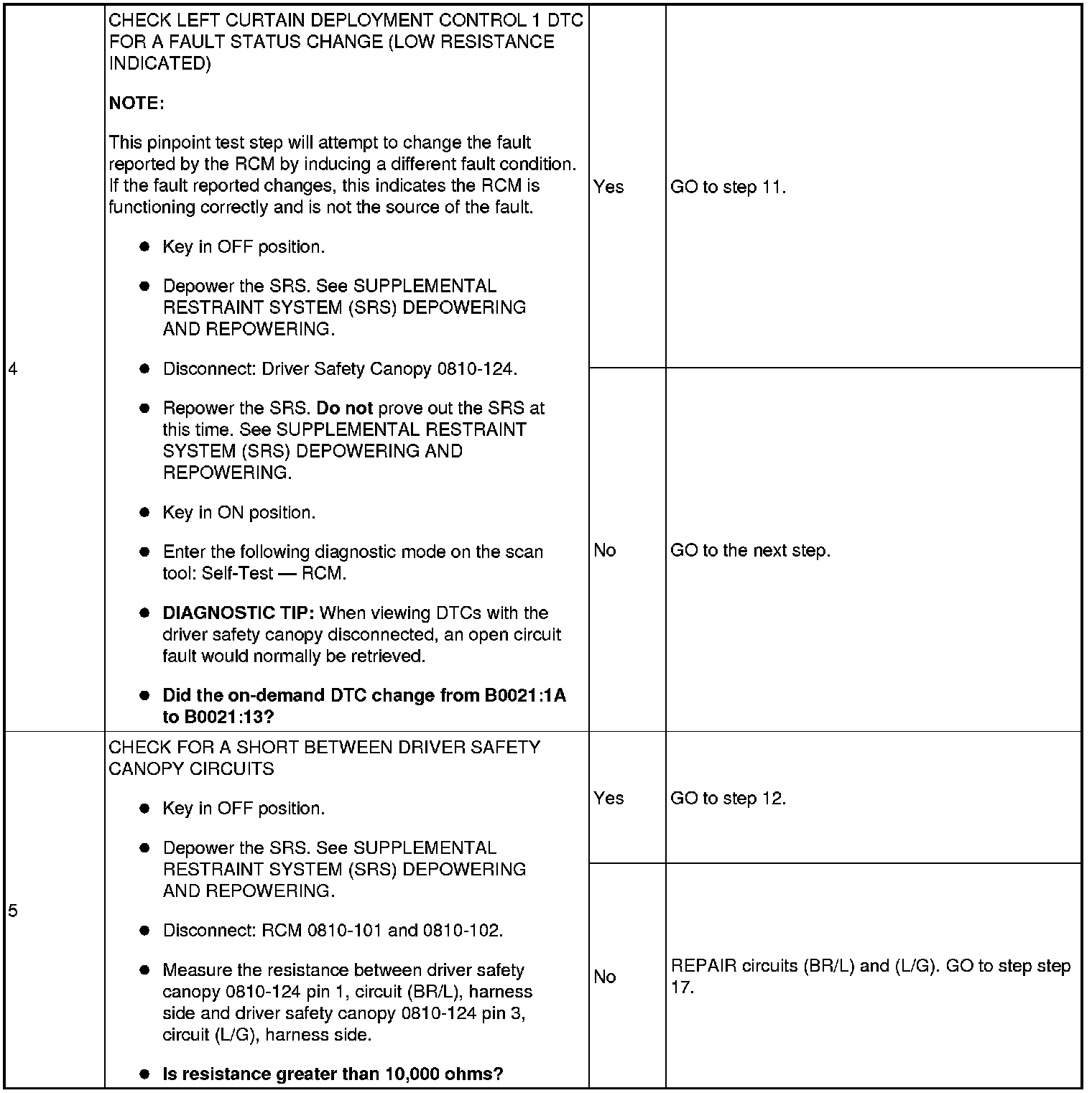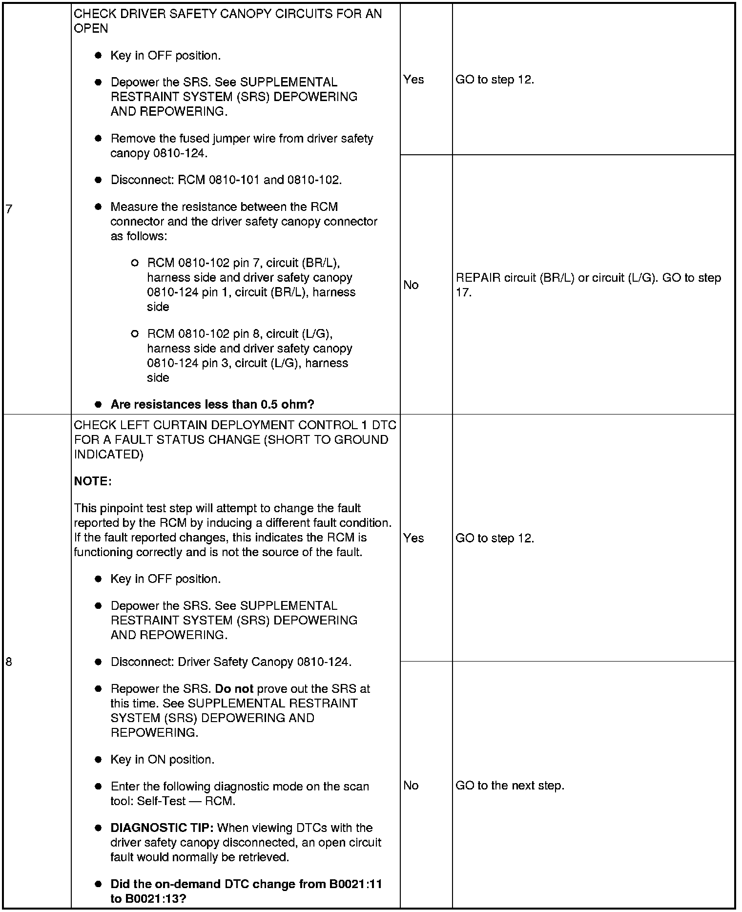 The RCM monitors driver safety canopy circuits for resistance and expects a normal resistance between 1.7 and 2.78 ohms.If resistance is between 1.47 and 1.69 ohms or between 2.79 and 3.31 ohms, there exists a strong potential for an intermittent fault to occur (a DTC may or may not set). The RCM will also set a DTC if the loop resistance is less than 1.46 ohms or greater than 3.32 ohms.