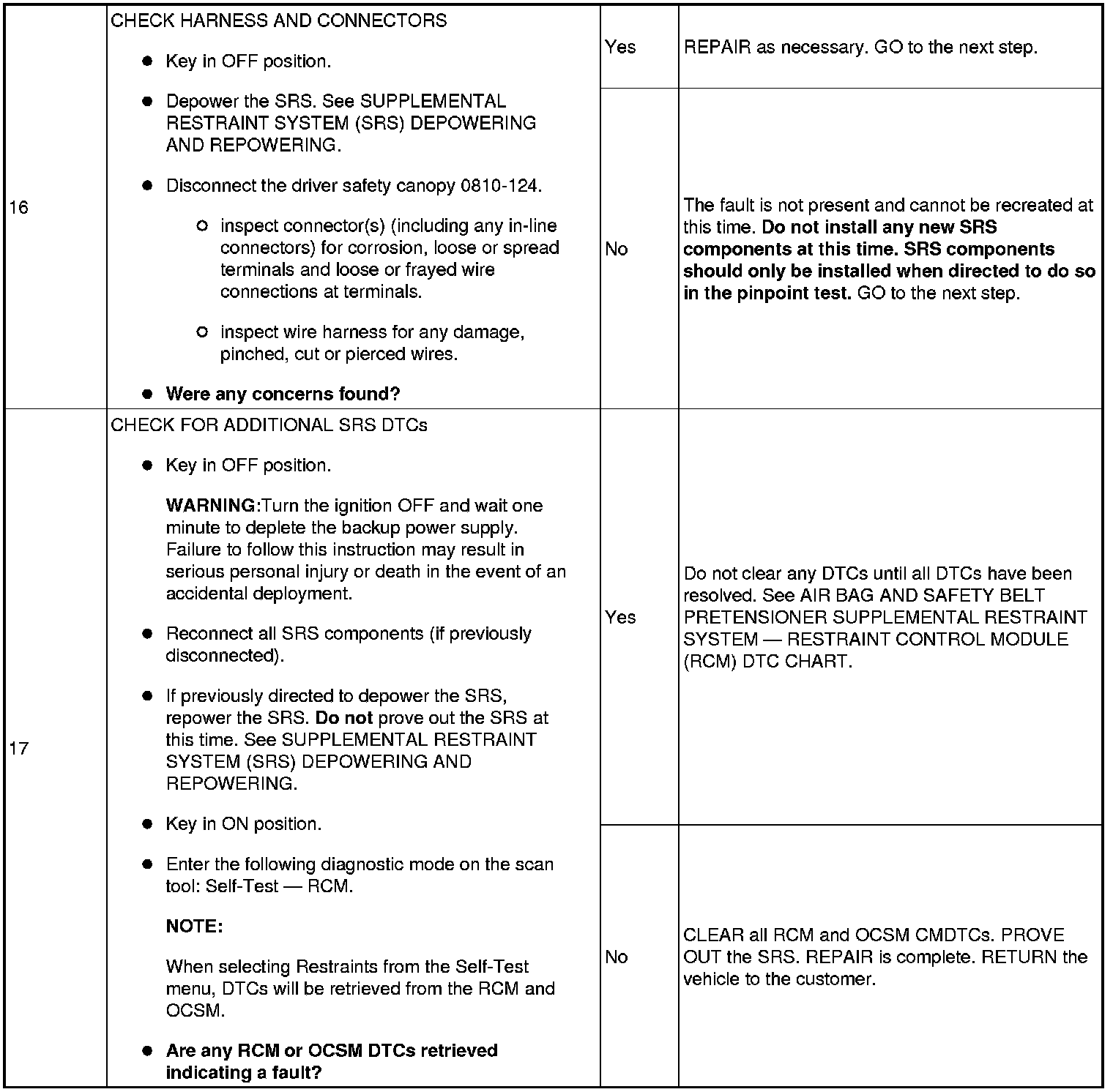 NOTE:Supplemental Restraint System (SRS) components should only be disconnected or reconnected when instructed to do so within a pinpoint test step. Failure to follow this instruction may result in incorrect diagnosis of the SRS.