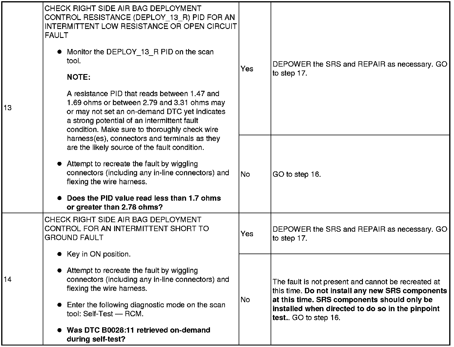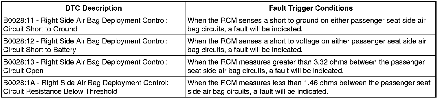 If a fault is detected, the RCM will store DTC B0028:11, 12, 13 or 1A in memory and send a message to the Instrument Cluster (IC) to illuminate the air bag warning indicator.The RCM monitors passenger seat side air bag circuits for resistance and expects a normal resistance between 1.7 and 2.78 ohms.If resistance is between 1.47 and 1.69 ohms or between 2.79 and 3.31 ohms, there exists a strong potential for an intermittent fault to occur (a DTC may or may not set). The RCM will also set a DTC if the loop resistance is less than 1.46 ohms or greater than 3.32 ohms.