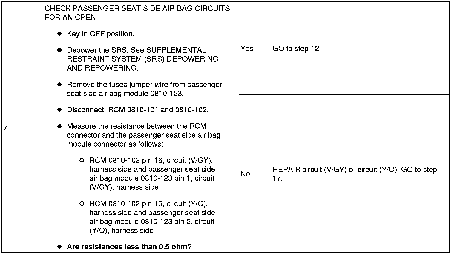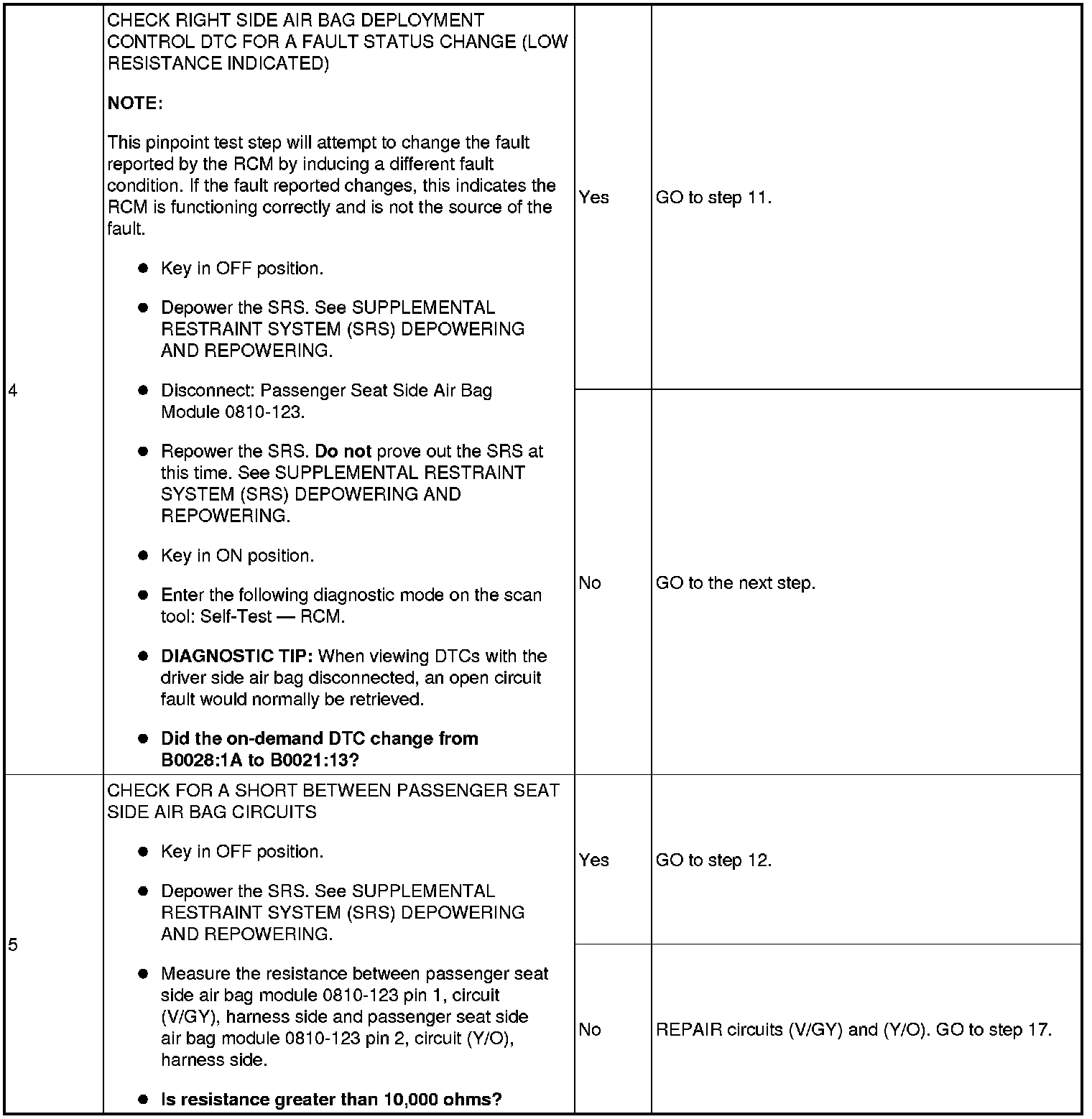The Restraints Control Module (RCM) continuously monitors passenger seat side air bag (right side air bag deployment control) circuits for the following faults: