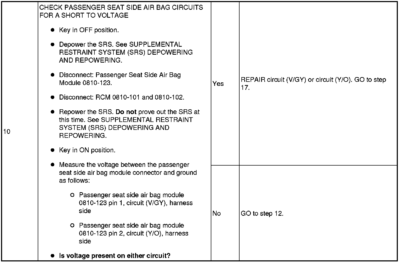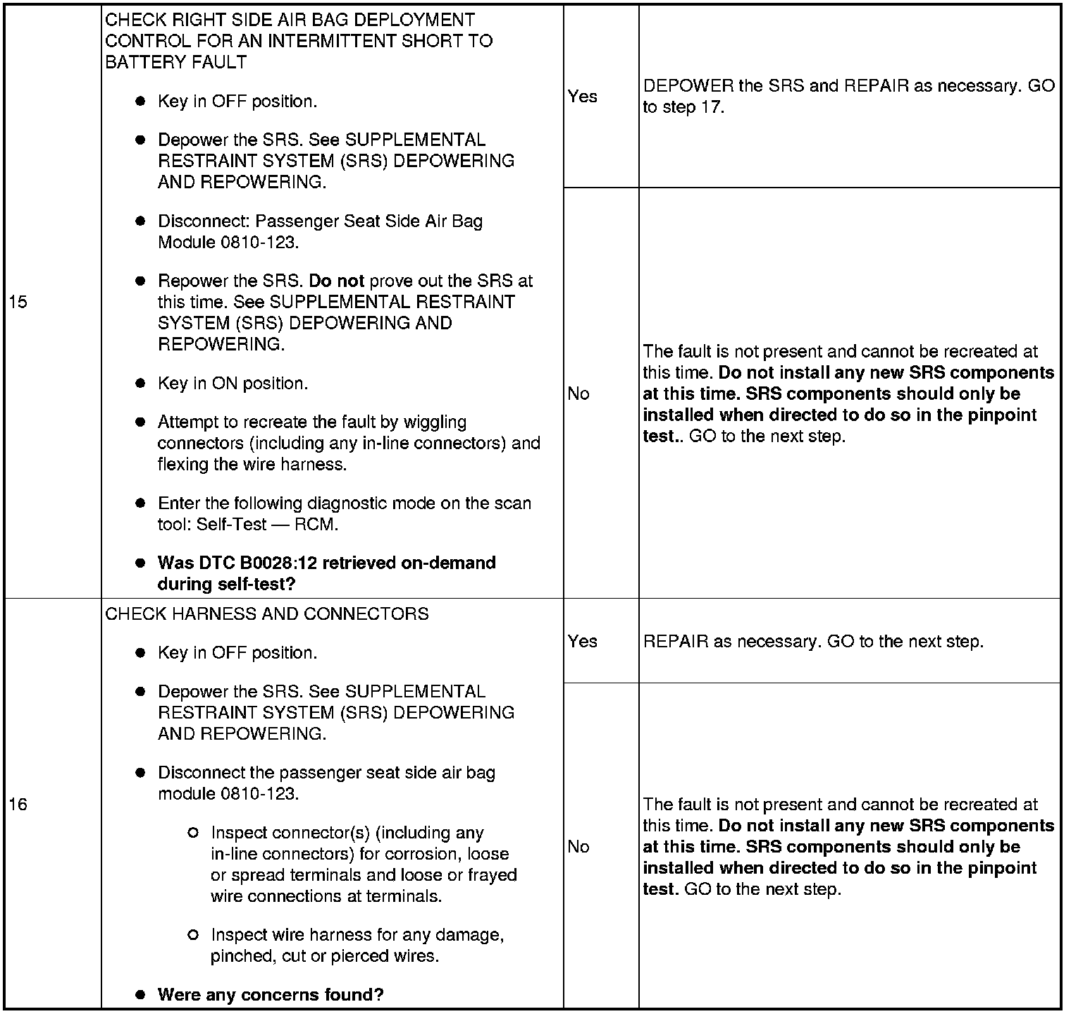 NOTE:Supplemental Restraint System (SRS) components should only be disconnected or reconnected when instructed to do so within a pinpoint test step. Failure to follow this instruction may result in incorrect diagnosis of the SRS.