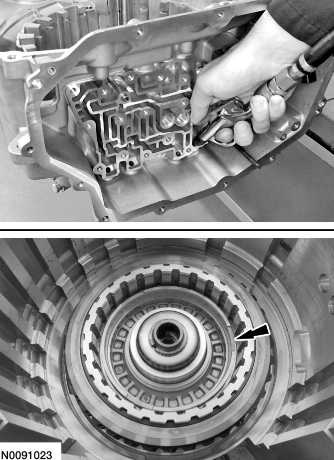 b. Lift the direct (3, 5, R) clutch so that the snap ring is in the groove of the pressure plate.