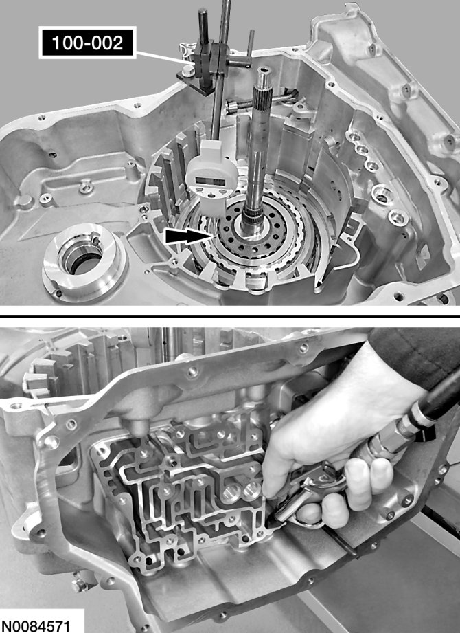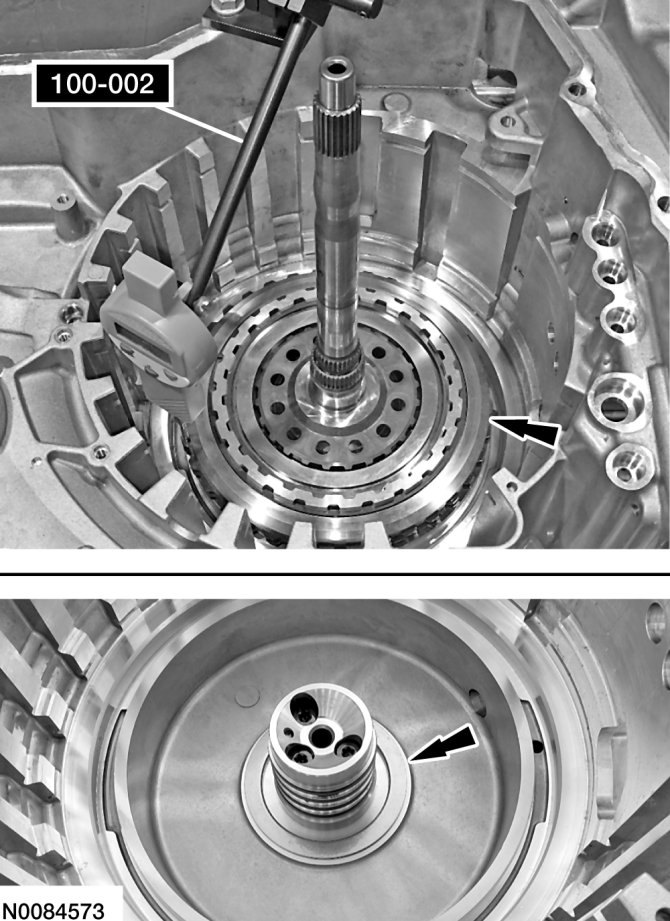 29. Position the O/D/direct clutch assembly in the transaxle case, install Dial Indicator Gauge With Holding Fixture or a suitable dial indicator and position the plunger on the O/D (4, 5, 6) clutch pressure plate. Apply 483 kPa (70 psi) of air pressure to the O/D (4, 5, 6) clutch piston port while recording the clutch pack clearance on the Dial Indicator. The clearance should be between 0.950 mm (0.037 in) and 1.778 mm (0.07 in). If the clearance is out of range, check the O/D (4, 5, 6) clutch pack for correct installation. If the O/D (4, 5, 6) clutch pack is correctly installed, install a new O/D (4, 5, 6) clutch pack.