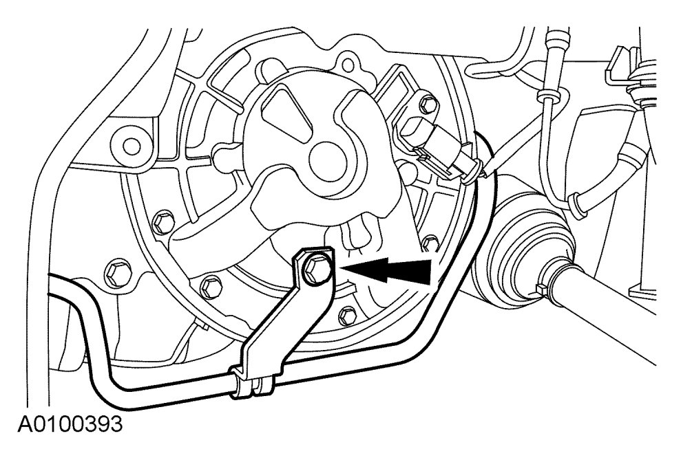 4. Disconnect and remove the fluid cooler tube bracket and bolt from the transaxle case.
