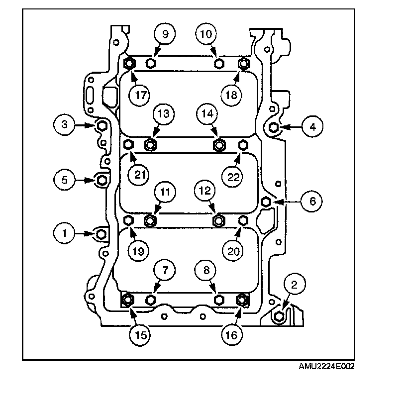 2. Remove the lower cylinder block bolts in the order indicated in the figure in, loosening several passes.