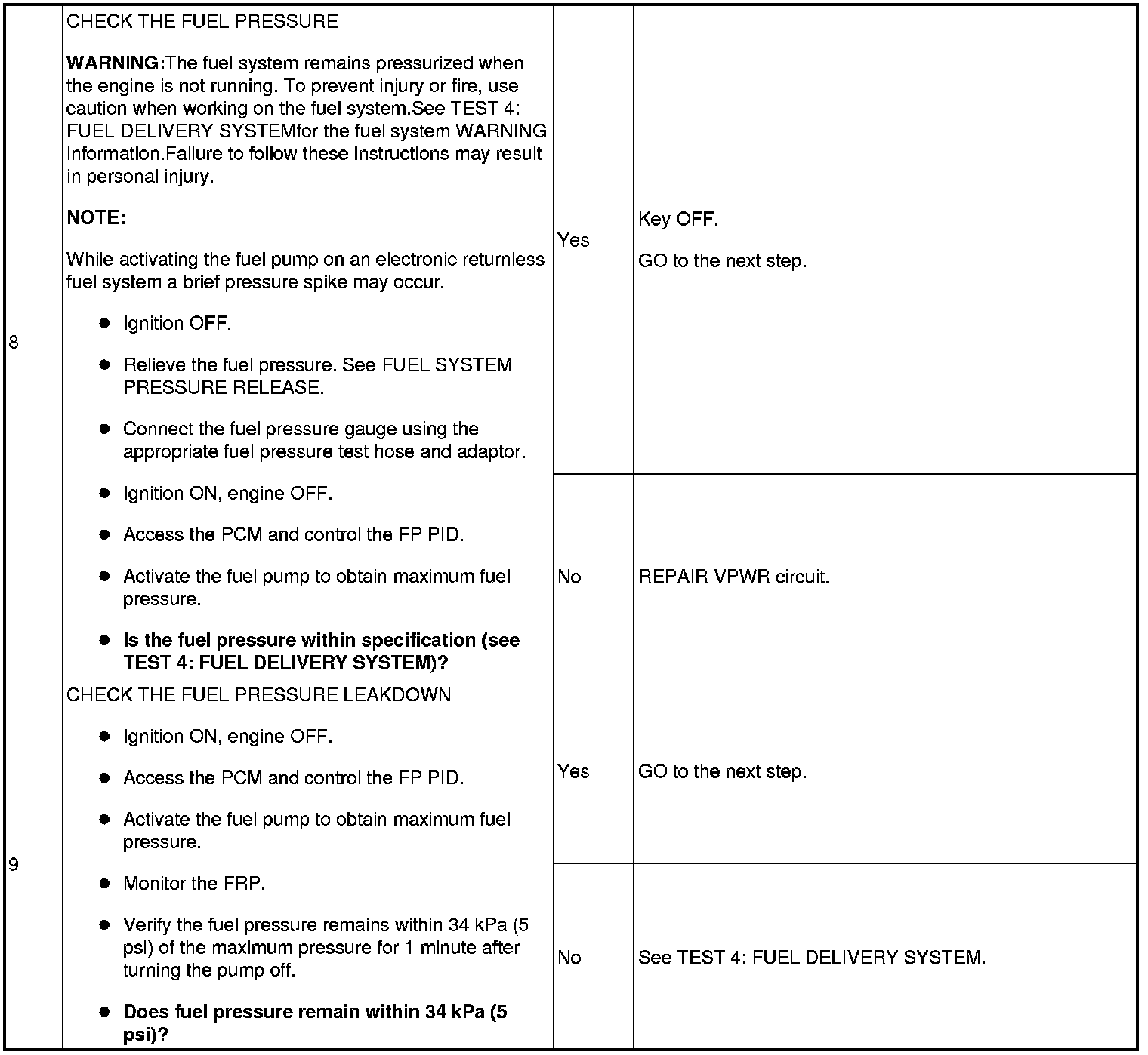 Stop this test at the first sign of a fuel leak and repair as required. No open flame. No smoking during fuel delivery checks. Failure to follow these instructions may result in personal injury.