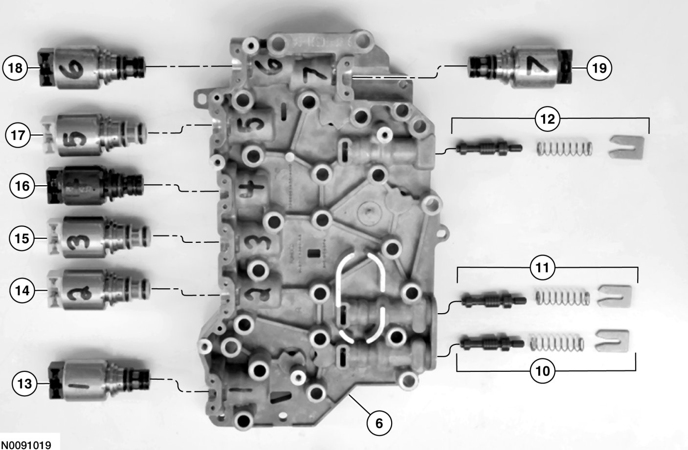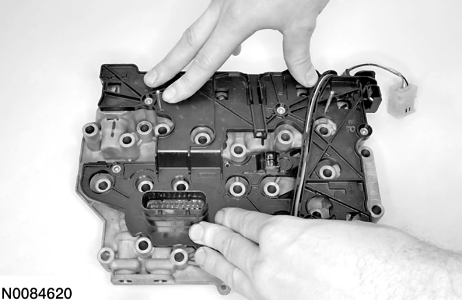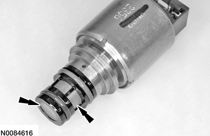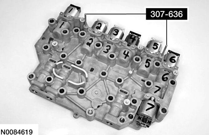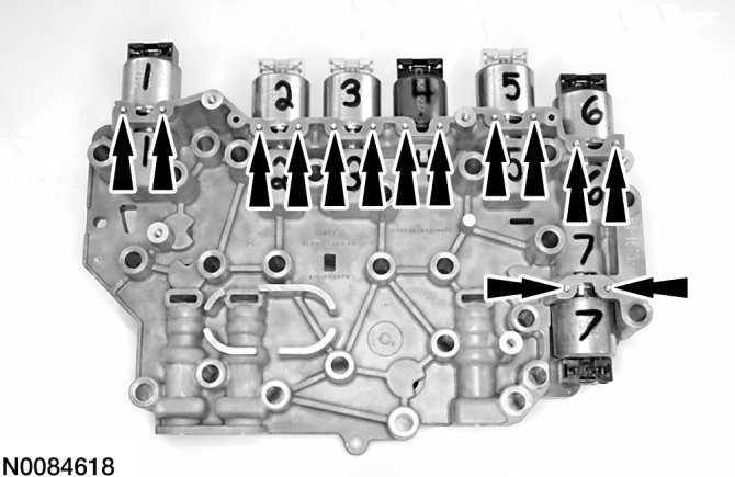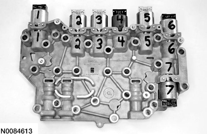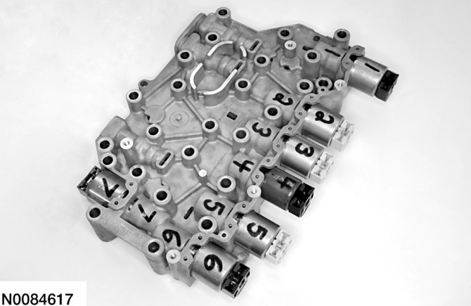 CAUTION:The solenoids are calibrated from the factory and are not all the same. Failure to install the solenoids in the ports they were originally in can result in damage to the transaxle or a harsh shift.