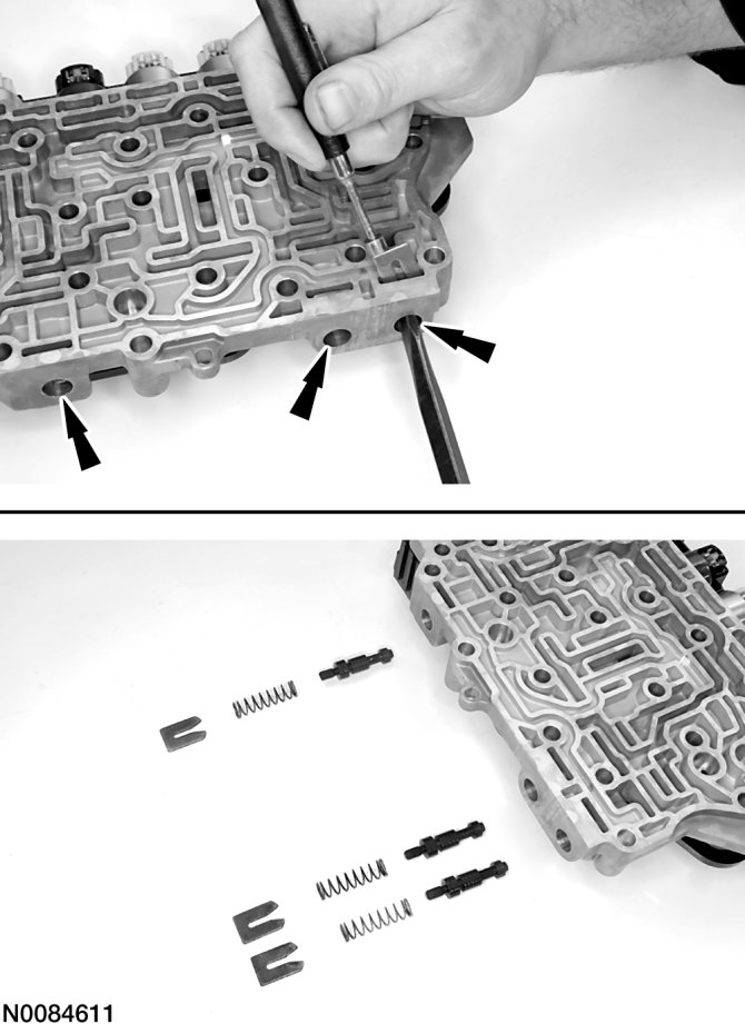 4. Compress the valve springs with a screwdriver and remove the retainers with a magnet. Remove the individual valves and springs from the solenoid body by tapping it on the palm of the hand to slide the valves out of the bores. See the solenoid body illustration at the beginning of this procedure for valve and spring locations.