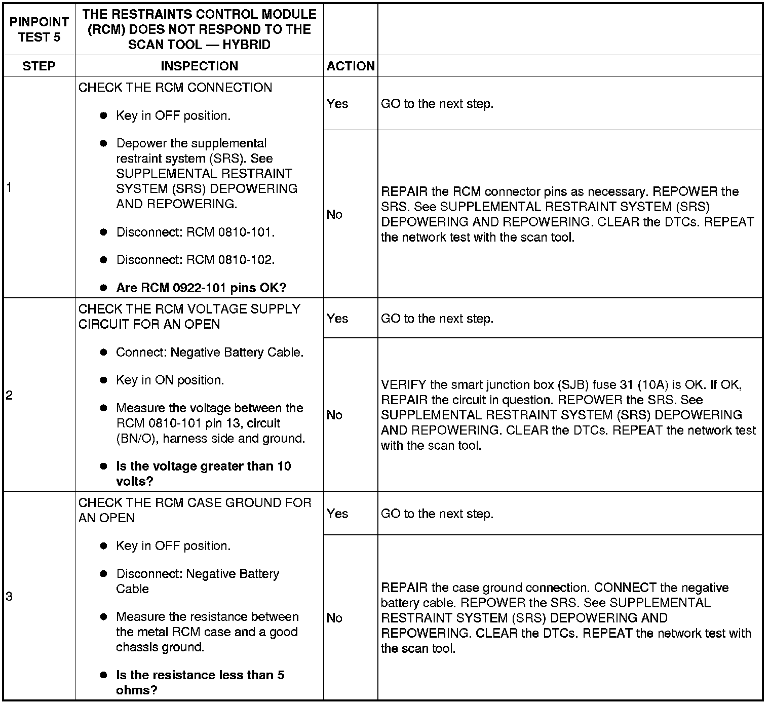 PINPOINT TEST 5: THE RESTRAINTS CONTROL MODULE (RCM) DOES NOT RESPOND TO THE SCAN TOOL - HYBRID