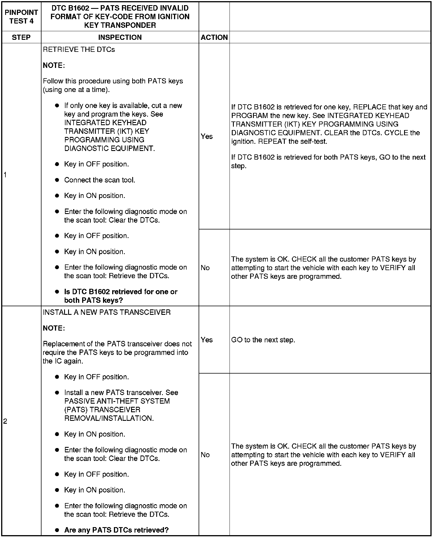 PINPOINT TEST 4: DTC B1602 - PATS RECEIVED INVALID FORMAT OF KEY-CODE FROM IGNITION KEY TRANSPONDER