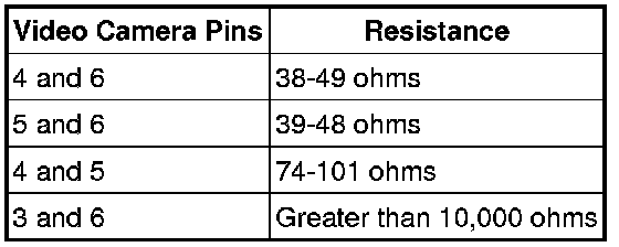 If the resistance values for the video camera are within the specifications listed, the video camera is functional at this time.If the resistance values for the video camera are not within the specifications listed, the video camera is inoperative at this time. Install a new video camera. See Service and Repair.