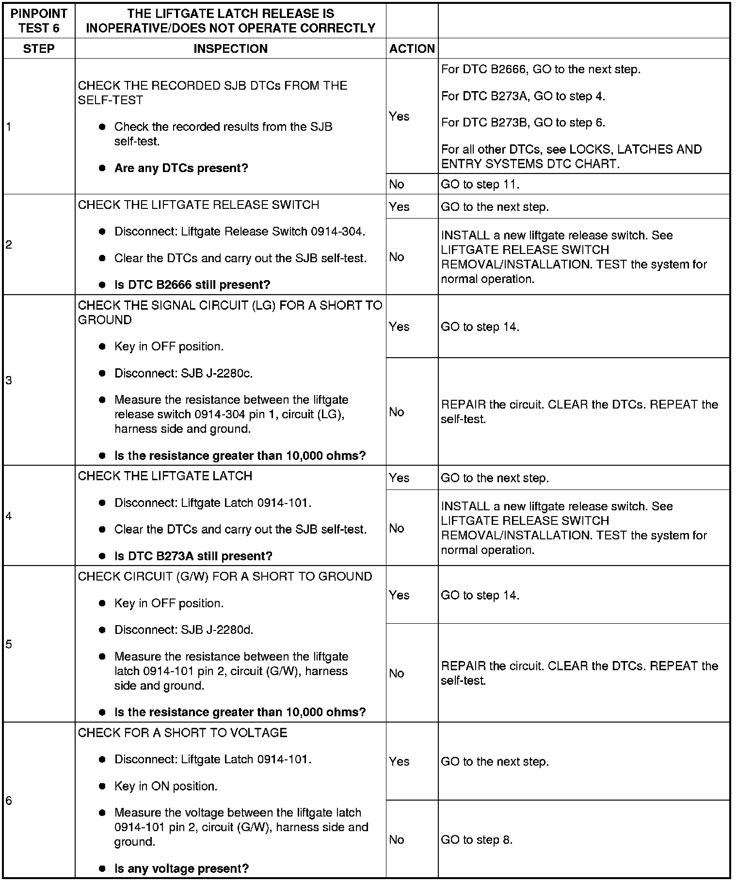 PINPOINT TEST 6: THE LIFTGATE LATCH RELEASE IS INOPERATIVE/DOES NOT OPERATE CORRECTLY