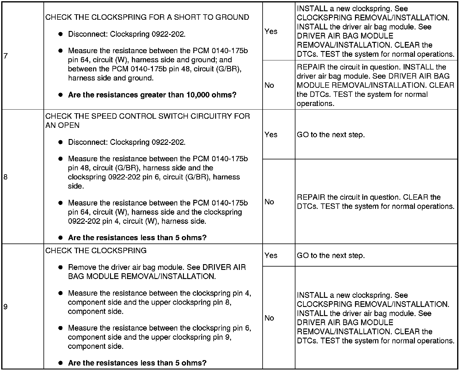 Voltage is sent from the PCM to the speed control switches through circuit (W). When a switch is pressed, the voltage is routed through a specific resistor value for each function. The PCM grounds the reference voltage through circuit (G/BR). The PCM uses this reference voltage to determine which speed control input function has been selected.