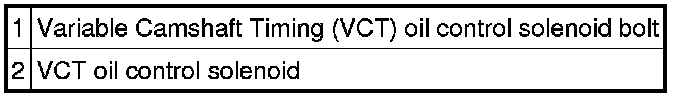 2. Remove the bolt and the Variable Camshaft Timing (VCT) oil control solenoid.