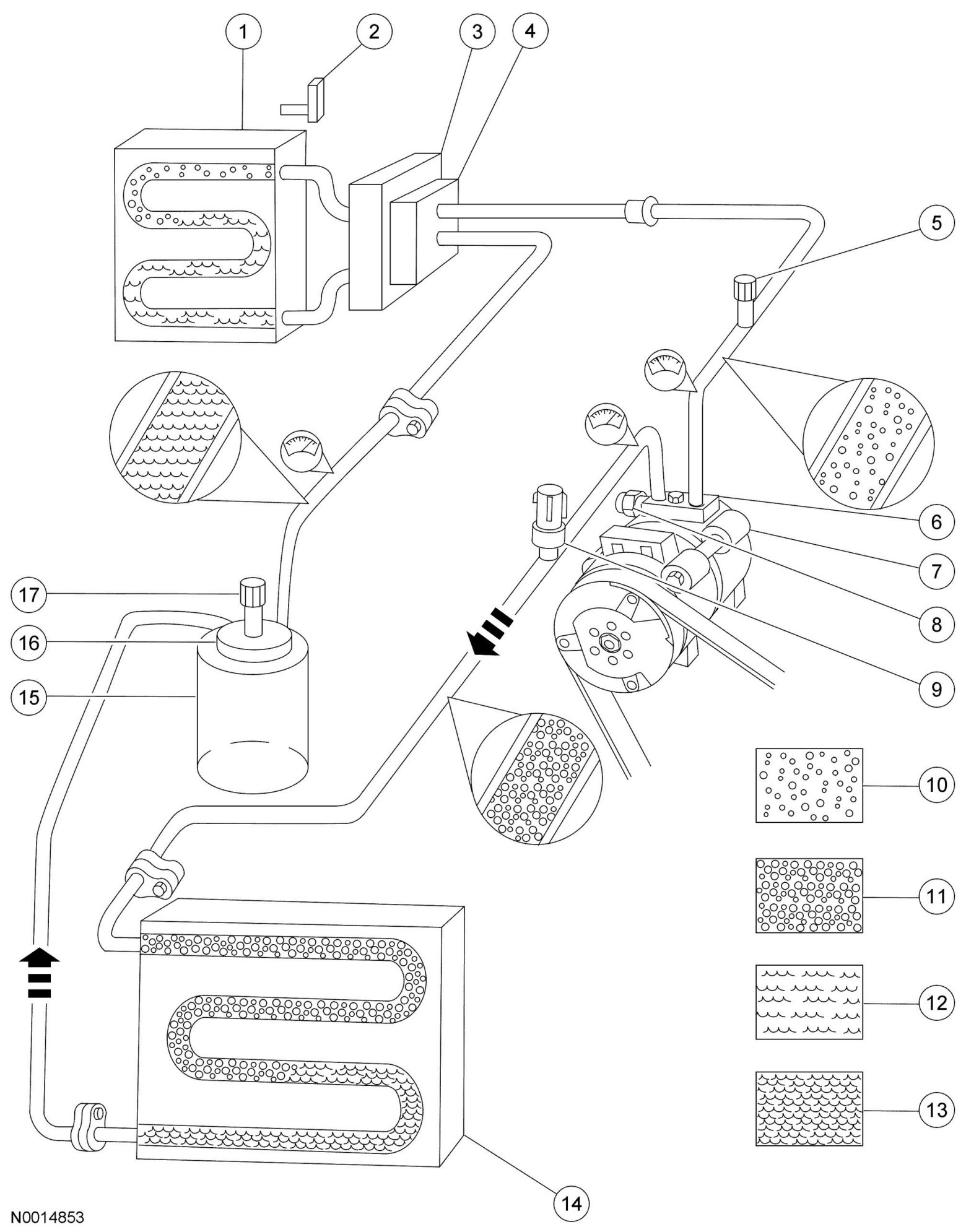 During stabilized conditions (air conditioning system shutdown), the refrigerant is in a vaporized state and pressures are equal throughout the system. When the A/C compressor is in operation it increases pressure on the refrigerant vapor, raising its temperature. The high-pressure and high-temperature vapor is then released into the top of the condenser core.The condenser core, being close to ambient temperature, causes the refrigerant vapor to condense into a liquid when heat is removed from the refrigerant by ambient air passing over the fins and tubing. The now liquid refrigerant, still at high pressure, exits from the bottom of the condenser core and enters the inlet side of the evaporator core orifice.The evaporator core orifice is the restriction in the refrigerant system that creates the low pressure drop in the evaporator core and separates the high and low pressure sides of the A/C system. As the liquid refrigerant leaves this restriction, its pressure and boiling point are reduced.The liquid refrigerant is now at its lowest pressure and temperature. As it passes through the evaporator core, it absorbs heat from the passenger compartment airflow passing over the plate/fin sections of the evaporator core. This addition of heat causes the refrigerant to boil (convert to gas). The now cooler passenger compartment air can no longer support the same humidity level of the warmer air and this excess moisture condenses on the exterior of the evaporator coils and fins and drains outside the vehicle.The suction accumulator is designed to remove moisture from the refrigerant and to prevent any liquid refrigerant that may not have been vaporized in the evaporator core from reaching the A/C compressor. The A/C compressor is designed to pump refrigerant vapor only, as liquid refrigerant will not compress and can damage the A/C compressor.