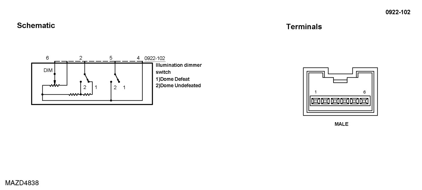 2. Inspect for continuity between the instrument panel dimmer switch terminals using a self-powered test light or an ohmmeter.