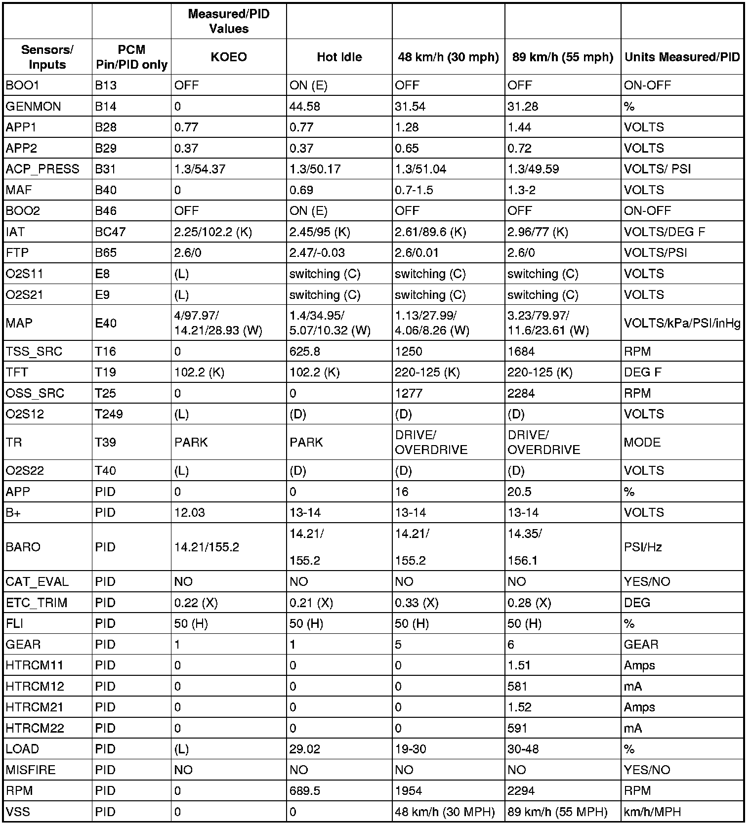 Values are taken at an altitude of approximately 189 meters (620 ft) above sea level with the engine at normal operating temperature and accessories off.See the Introduction Section, Acronyms and Definitions for technical terms applicable to Mazda Motor Company products.See Engine Control (EC) System for PID descriptions.For detailed transmission diagnostics, see Diagnostics. Transmission signals may be referred to in either alpha or numeric form. For example, 1=A, 2=B, 3=C.