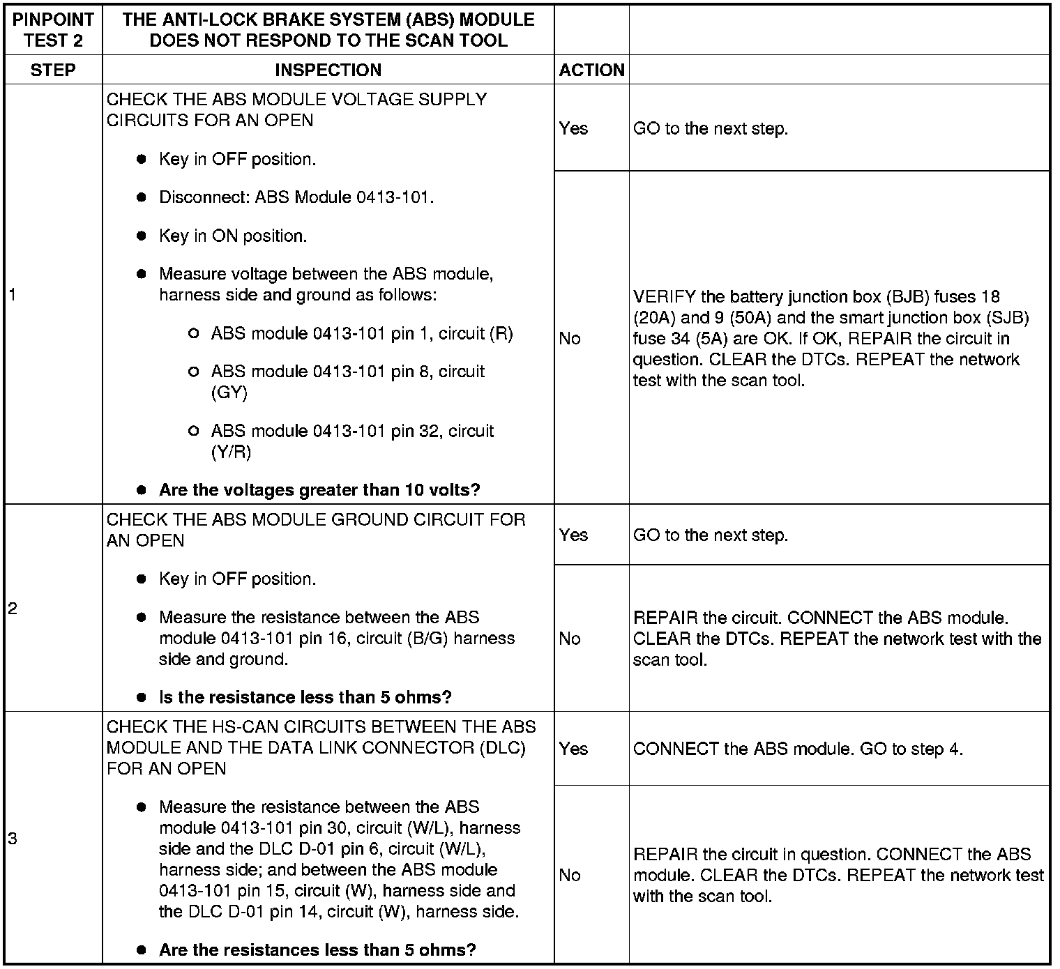 PINPOINT TEST 2: THE ABS MODULE DOES NOT RESPOND TO THE SCAN TOOL