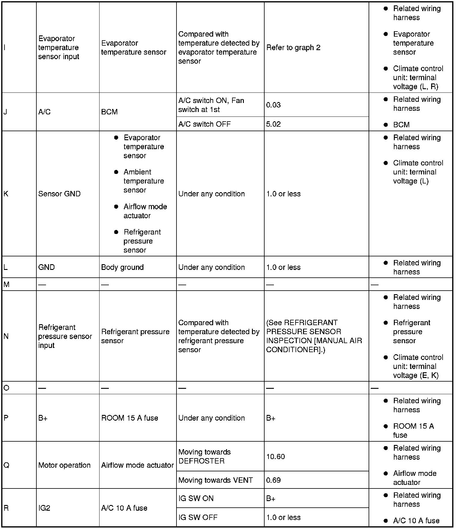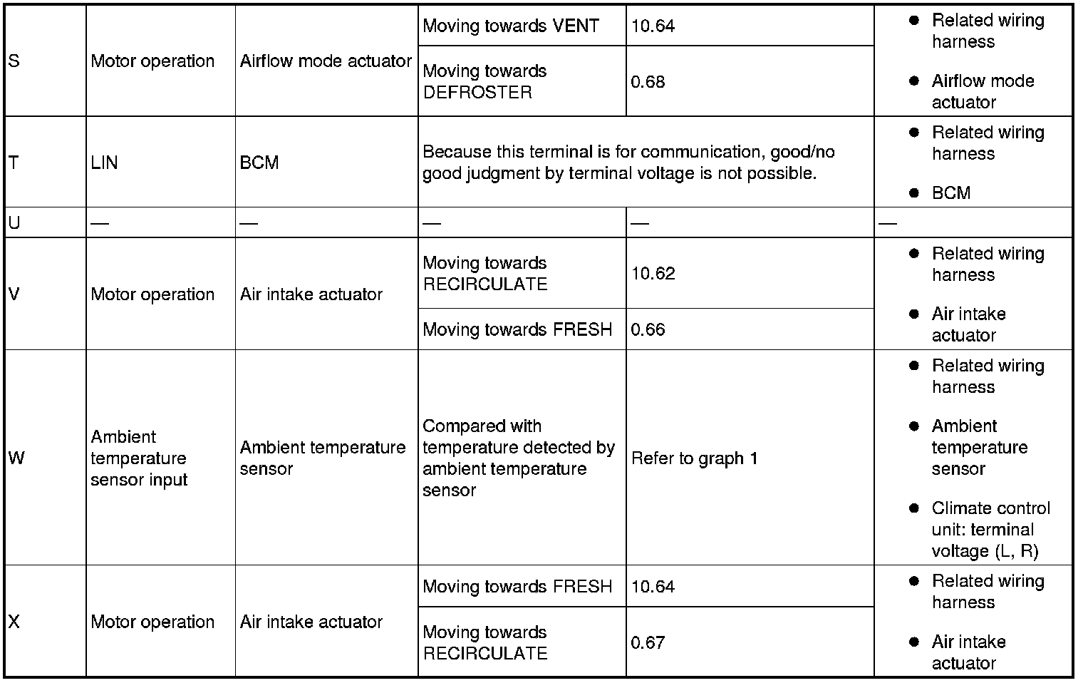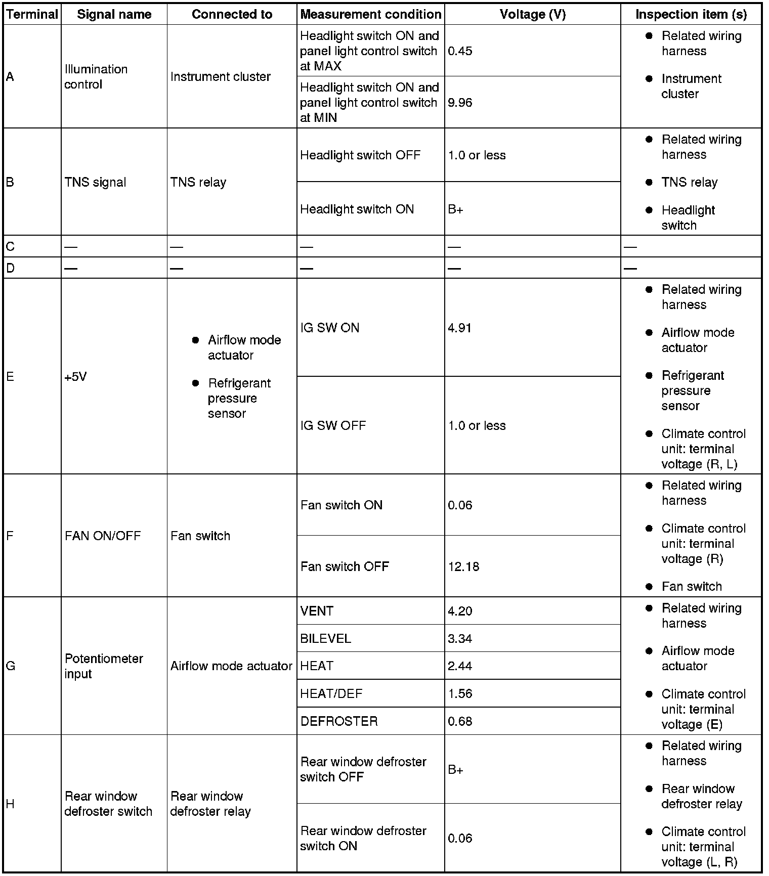 - If the parts under "Inspection item (s)" are found to be normal, replace the climate control unit.