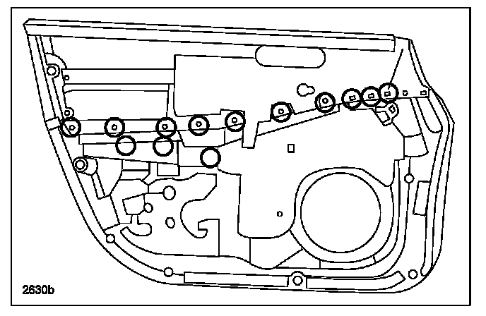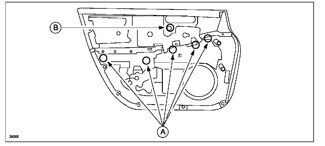 2. Remove the applicable door trim according to the MS3 online instructions or the Workshop Manual (section 09-17 FRONT DOOR TRIM REMOVAL/INSTALLATION or REAR DOOR TRIM REMOVAL/INSTALLATION).