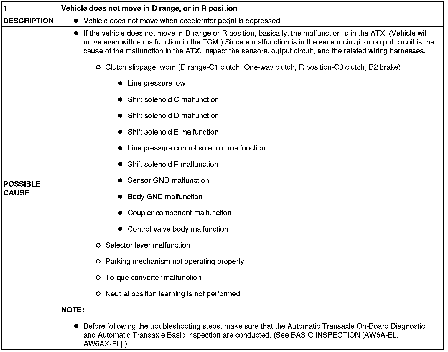 NO.1 VEHICLE DOES NOT MOVE IN D RANGE, OR IN R POSITION [AW6A-EL, AW6AX-EL]