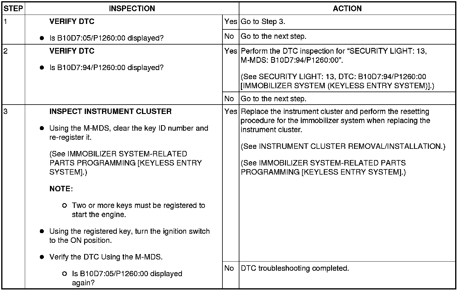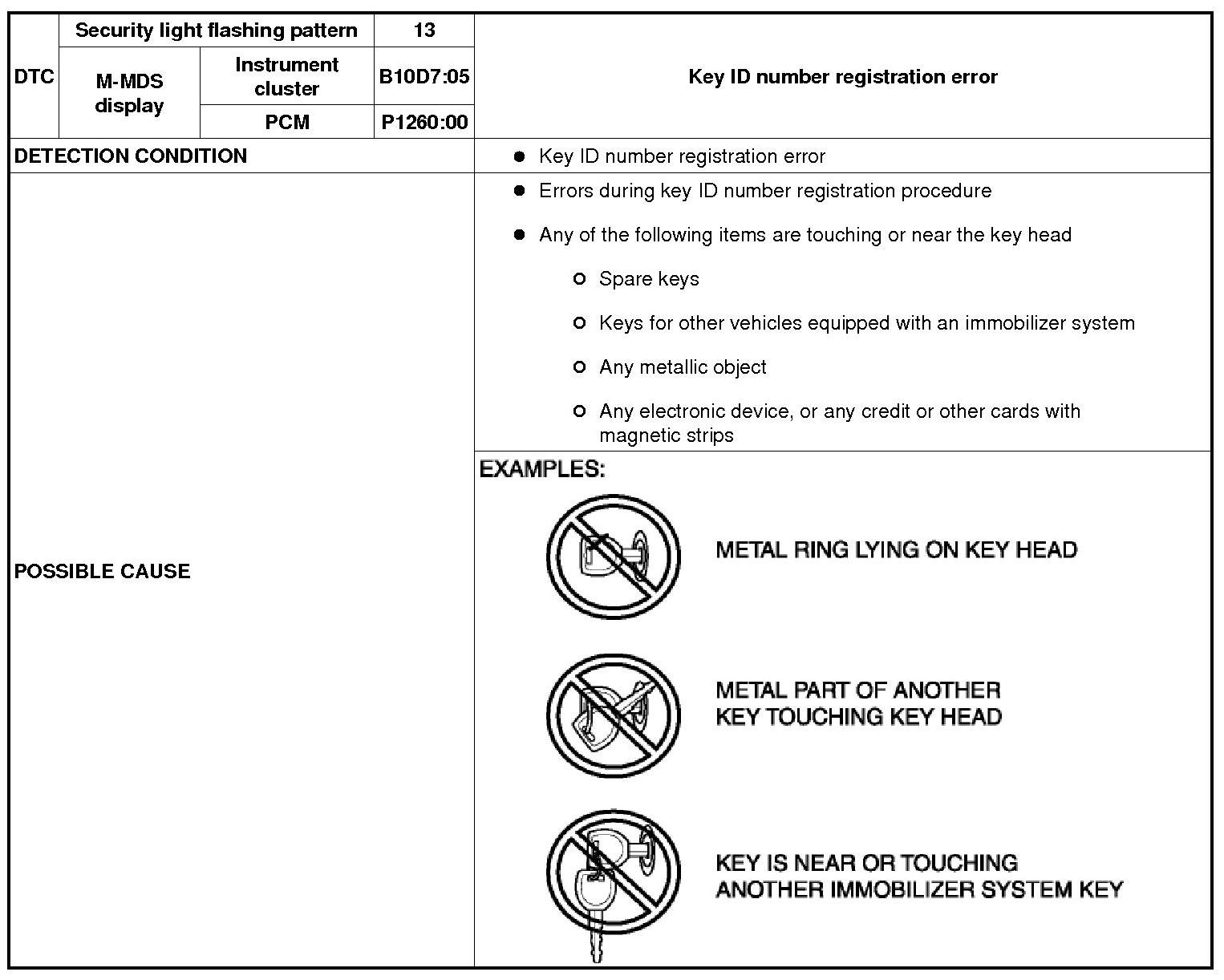 SECURITY LIGHT: 13, DTC: B10D7:05 / P1260:00 [IMMOBILIZER SYSTEM (KEYLESS ENTRY SYSTEM)]