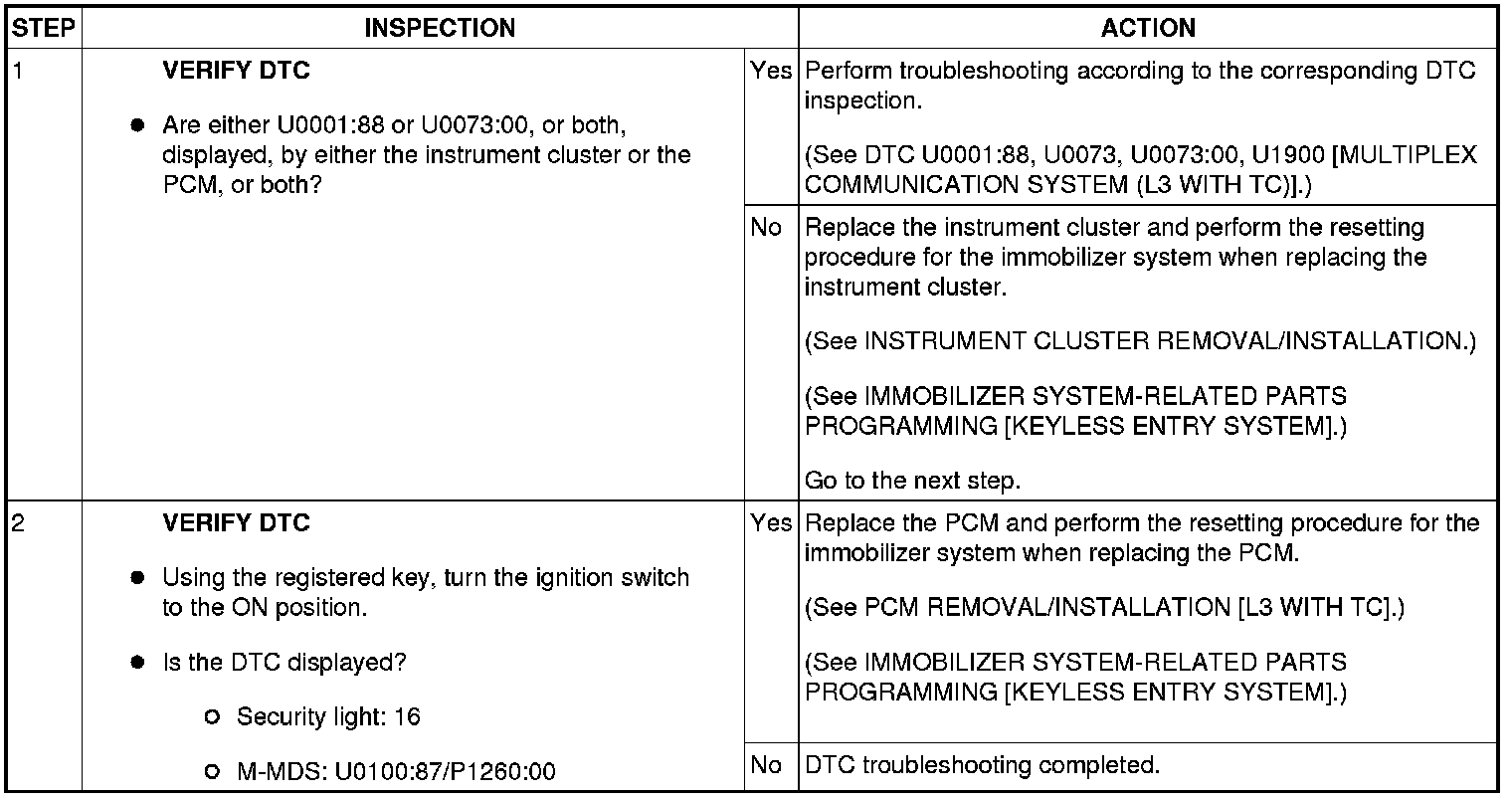 SECURITY LIGHT: 16, DTC: U0100:87 / P1260:00 [IMMOBILIZER SYSTEM (KEYLESS ENTRY SYSTEM)]