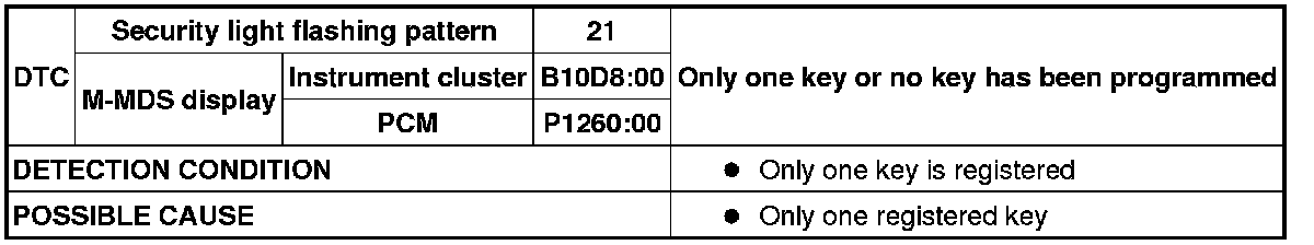 SECURITY LIGHT: 21, DTC: B10D8:00 / P1260:00 [IMMOBILIZER SYSTEM (KEYLESS ENTRY SYSTEM)]