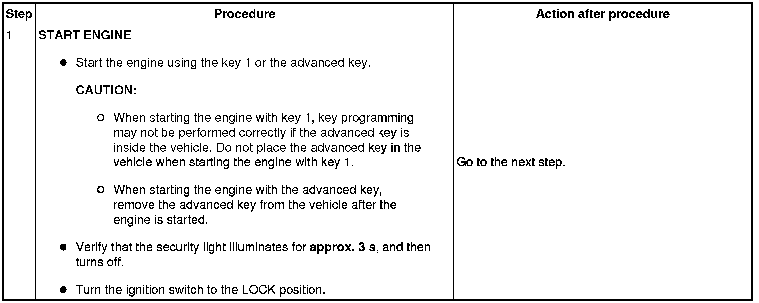 - If the engine is started during immobilizer system-related parts programming, the programming mode cancels. Therefore, do not start the engine unless indicated in the procedure. Repeat the procedure from the beginning if the engine is started during the immobilizer system-related parts programming.