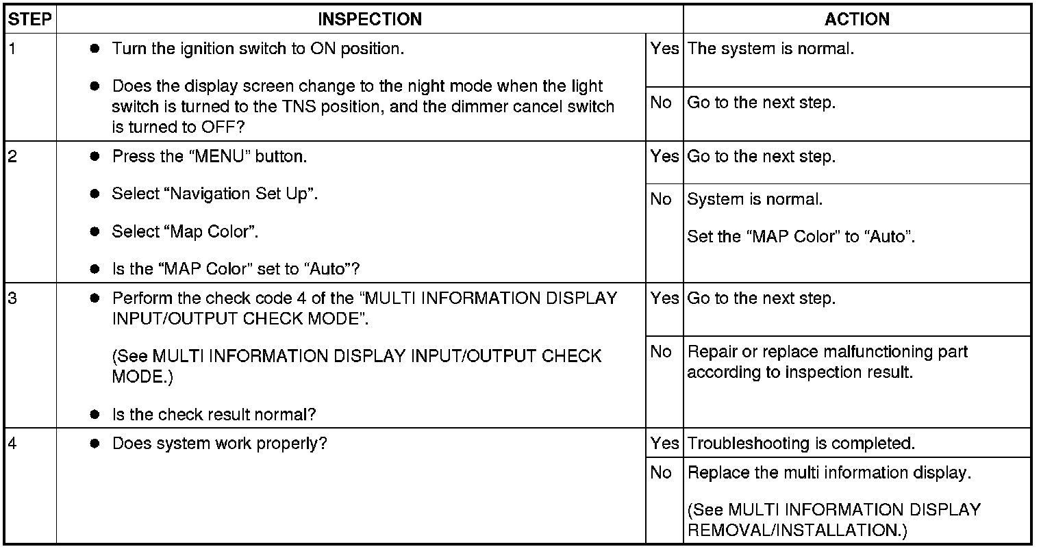 NO.7 DISPLAY SCREEN DOES NOT CHANGE TO THE NIGHT MODE (FRONT AND REAR COMBINATION LIGHTS OPERATE NORMALLY.) [CAR-NAVIGATION SYSTEM (INTEGRATED MULTI INFORMATION DISPLAY)]