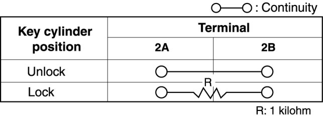 Inspect for continuity between the front door key cylinder switch terminals.