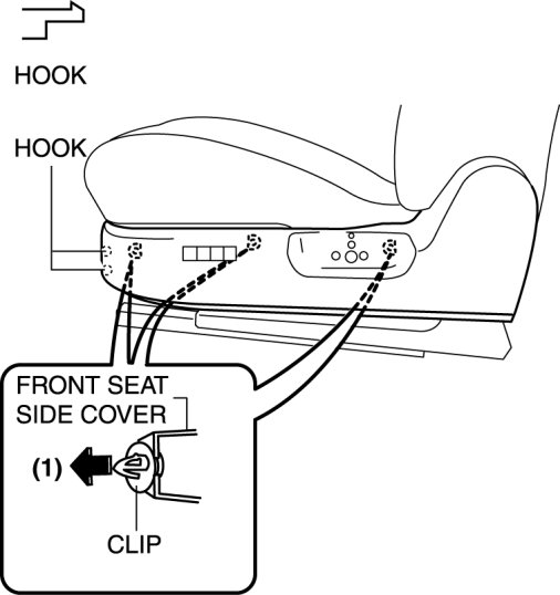1. Pull the front seat side cover in the order of (1), shown in the figure to disengage the hooks and clips.