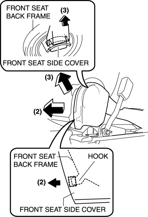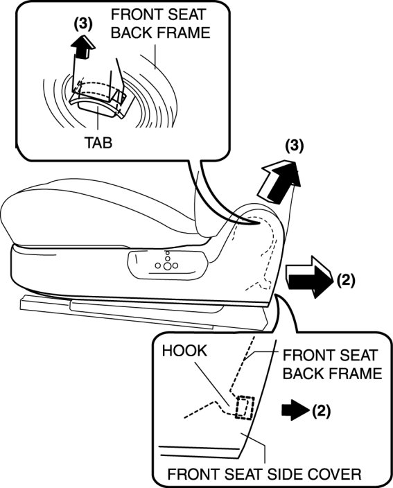 2. Pull the front seat side cover in the order of (2), (3) shown in the figure to disengage the hook and tab.
