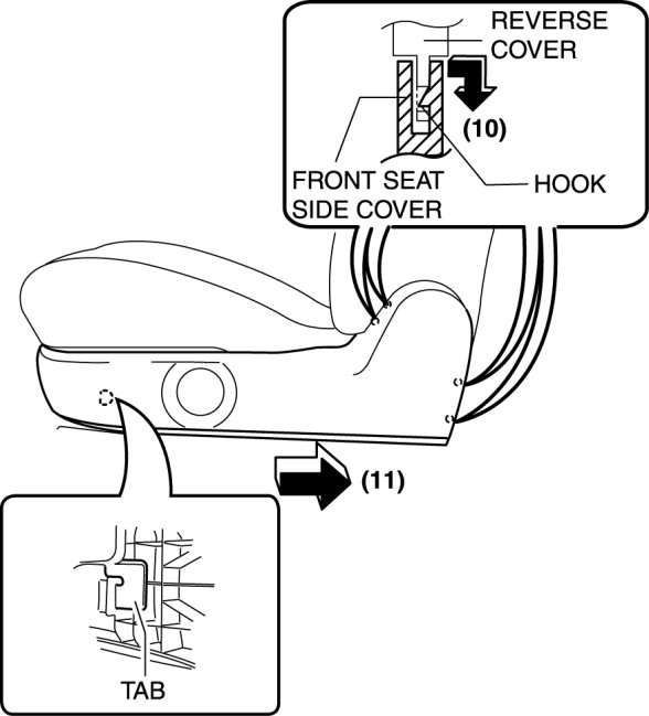8. Pull the front seat side cover in the order of (10), (11) shown in the figure to disengage the hooks and tab.