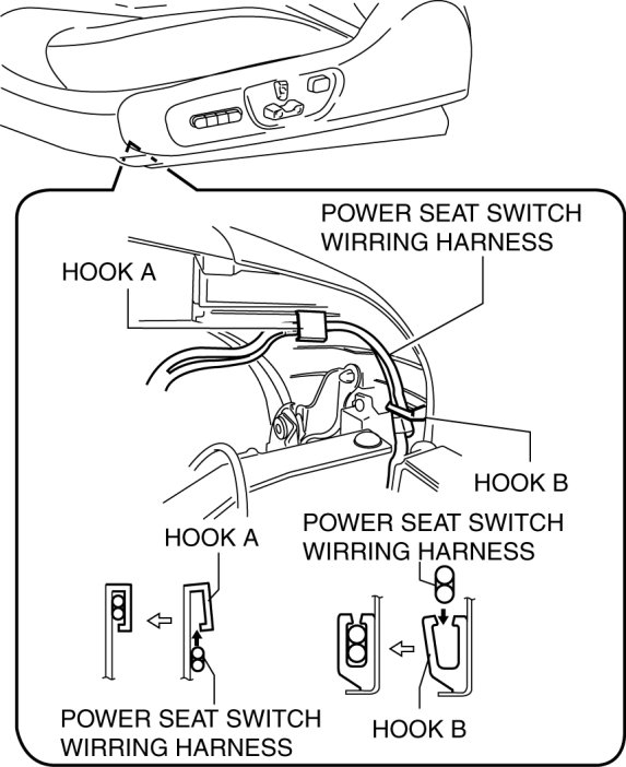 - The power seat switch wiring harness is clamped at the hook A, B and the marks by the green tape on the power seat switch wiring harness. While actual work, the harness is as blind location but you can move the power seat switch wiring harness from the hook A,B easily by pulling to backward.