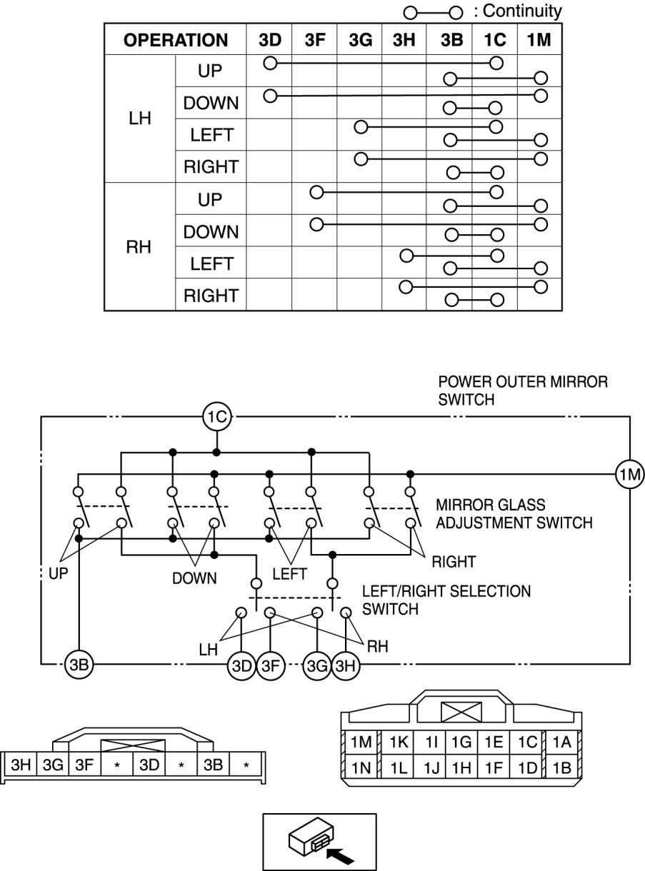 5. Using a tester, verify that the continuity between the power outer mirror switch terminals is as indicated in the table.