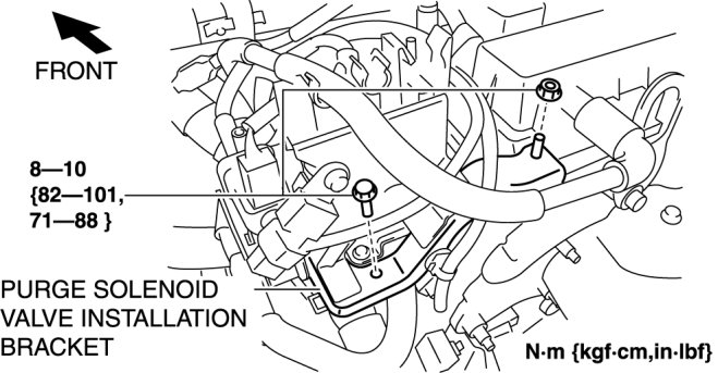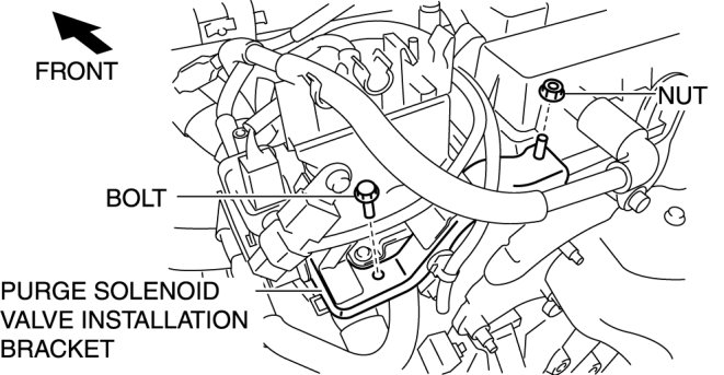 1. Remove the purge solenoid valve installation bracket with the evaporative hose still connected and set it out of the way.