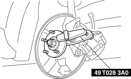 1. Remove the brake caliper component from the steering knuckle and suspend it out of the way using a cable.