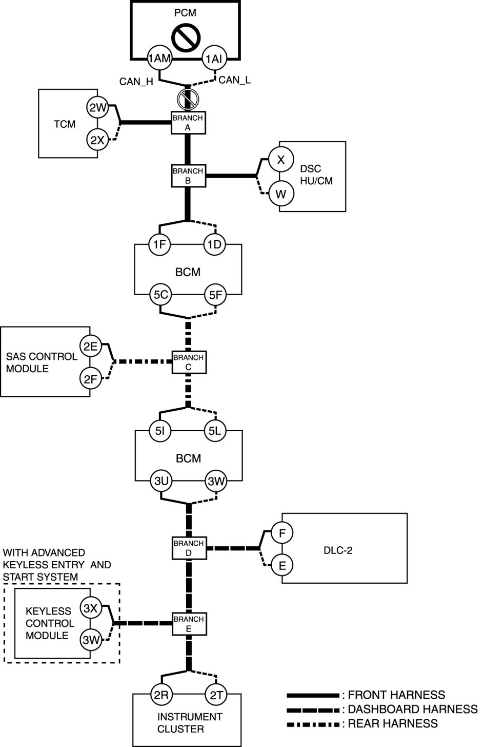 - Wiring harness between keyless control module terminal 3W and branch E
