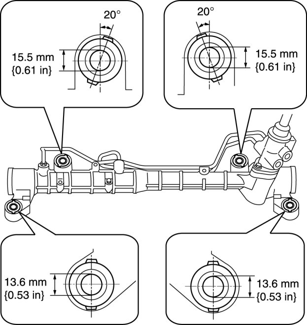 2. Temporarily install the steering gear so that the mounting rubber are in the positions shown in the figure.