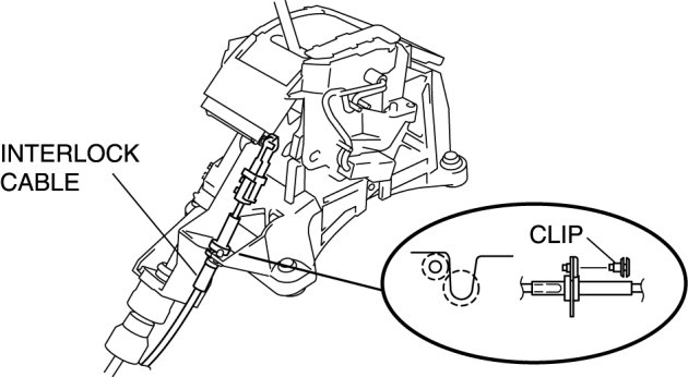14. Fit the interlock cable in the U-groove in the selector lever base plate and install the clip.