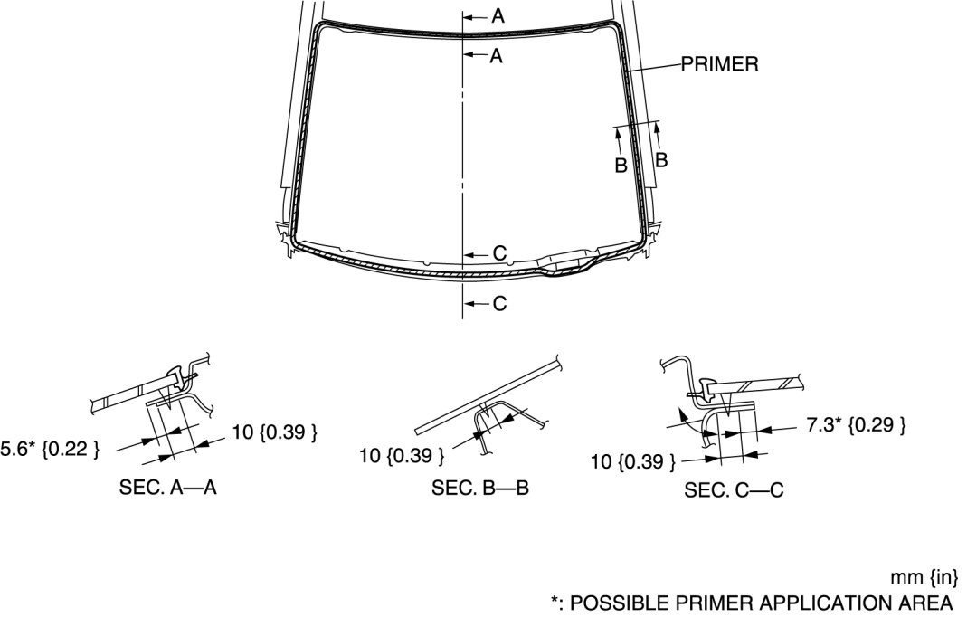 8. If the sealant has come off completely in any one place, apply some primer after degreasing, and allow it approx. 30 min to dry. Then apply 2 mm {0.08 in} thickness of new sealant.