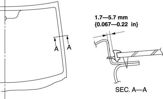 13. Verify that the clearance of the A-pillar is within the range shown in the figure, and press along the perimeter of the glass.