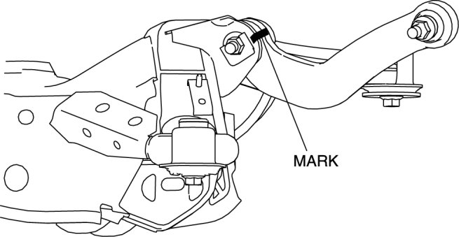 - The rear upper arm inner bolt cannot be tightened completely with the rear upper arm installed to the vehicle due to the narrow operation space. Therefore, mark the position before removing the rear upper arm, align the rear crossmember and rear upper arm markings when installing the rear upper arm, and tighten the rear upper arm inner bolt completely before installing the rear crossmember component to the vehicle.