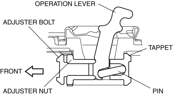 1. Install the operation lever, pin, adjuster bolt and nut, and tappet so that the adjuster nut is facing toward the vehicle front.
