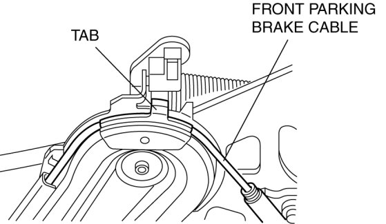 1. Verify that the front parking brake cable is installed below the cable deviation prevention tab of the brake cable.