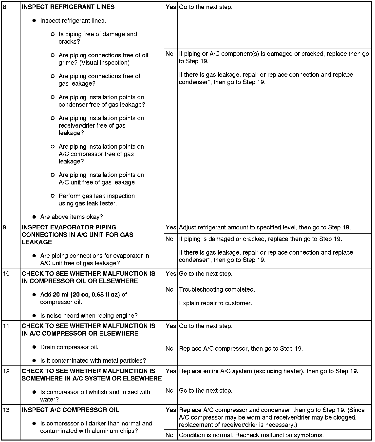 If there is gas leakage, air enters into the A/C system. The desiccant within the receiver/drier absorbs the moisture from the air and becomes saturated. If the A/C system is used in this condition, the inside of the A/C compressor will begin to rust due to this moisture, which may cause lock up or noise to occur. Therefore, replacement of the receiver/drier is necessary.